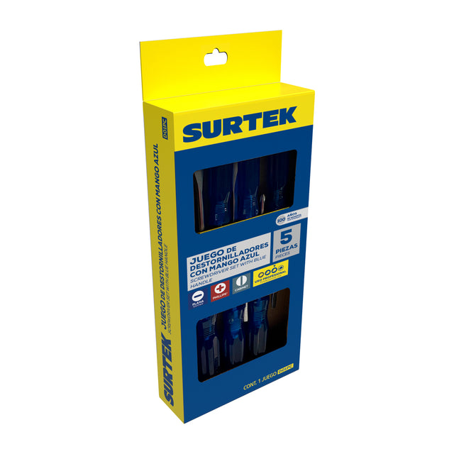 JUEGO DE DESTORNILLADORES CON MANGO AZUL COMBINADOS, 5 PIEZAS EN CAJA SURTEK