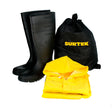 -Impermeable con cintas reflejantes de 2" para mayor visibilidad. Botas con suela grabada antiderrapante y descalzador en talón. Bolsa tipo morral con características impermeables.