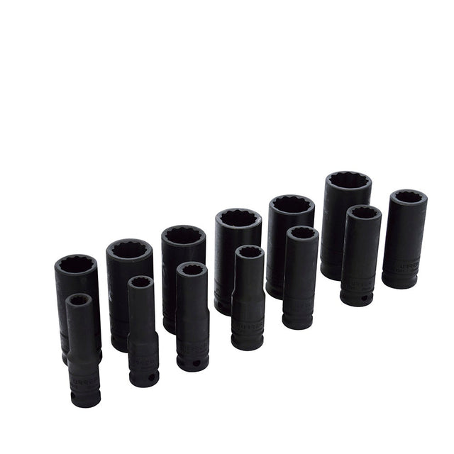 JUEGO DE 13 DADOS LARGOS DE IMPACTO EN PULGADAS CUADRO DE 1/2", 12 PUNTAS URREA